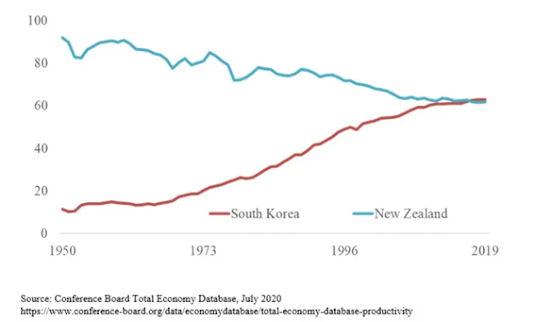 Economist Dr Üngör of Otago raised this in his recent Newsroom column. As shown in Figure 1, South Korea’s labour productivity level was less than 12% of US labour productivity in 1950, but by 2019 it was 63%. New Zealand was at 92% of the US in 1950 but dropped to 62% by 2019. The figure provides a humbling picture for New Zealand – The South Koreans have overtaken New Zealanders and we are falling behind the best performers in the world today. Back then, New Zealand was once one of the few nations with one of the highest GDP per capita in the world, but since then we have faltered into a mid-tier economy.